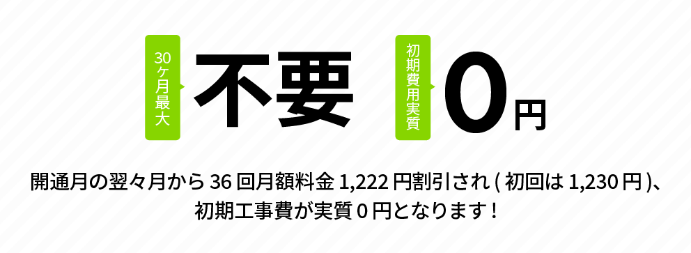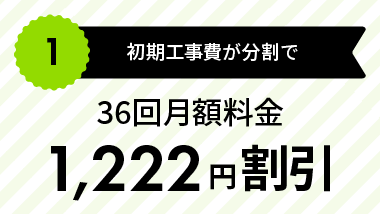 初期工事費が開通月の翌々月から36回月額料金1,222円割引となりますので、初期工事費が実質0円でご利用いただけます。